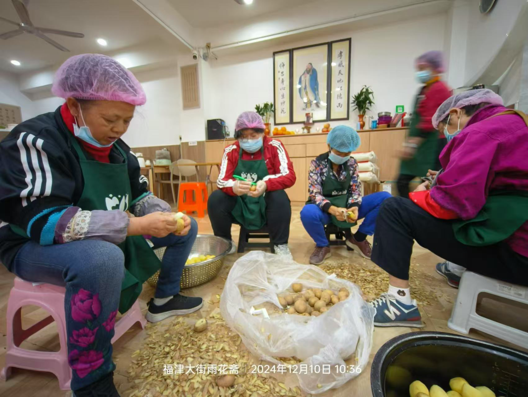 余昭蓉说,由于福津雨花斋在市中心老城区,筹建装修也经历挺多困难,但想想那个长长的走廊,老人们等待吃饭不用遭受风吹日晒,又没有来往机动车,加上这不出一公里就有4所幼儿园,4所小学和1所中学,这么好的地方,再困难都值得。于是,他们夫妻在2021年把这里买下来,意在长期提供免费餐厅的场所。这也是余昭蓉经营的第四家雨花斋。
