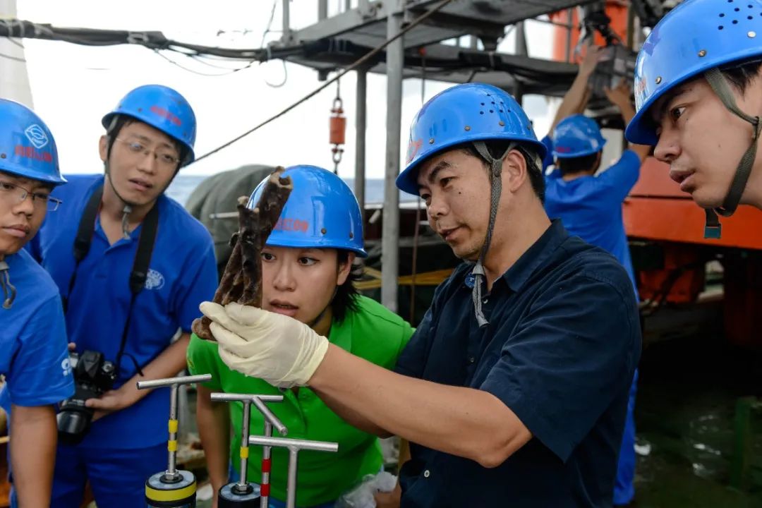 王春生(右二)在“向阳红”科考船上向团队人员介绍海底采集的标本