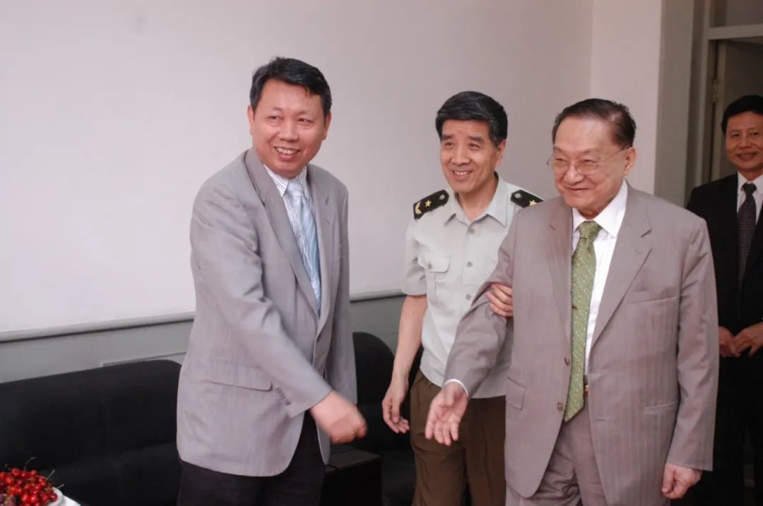 孙立川(左)陪同著名武侠小说家、报人金庸先生出席解放军艺术学院讲座,中为中文系同班同学、时任军艺院长的陆文虎少将