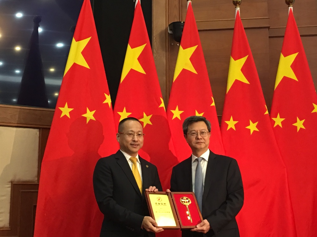 厦门市授予曾志龙(左)“荣誉市民”称号