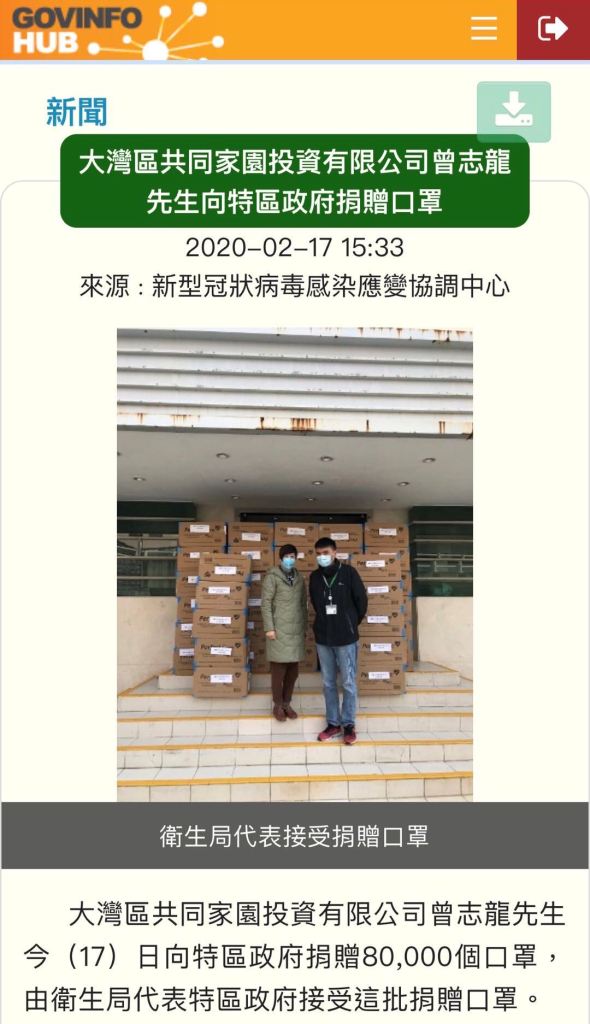 2020年初,新冠肺炎疫情突然袭来。曾志龙一方面率领澳门校友会,联合旅港校友会募捐,购买医疗设备捐赠给武汉协和医院;同时个人向澳门特区政府捐赠8万个口罩用于抗疫。