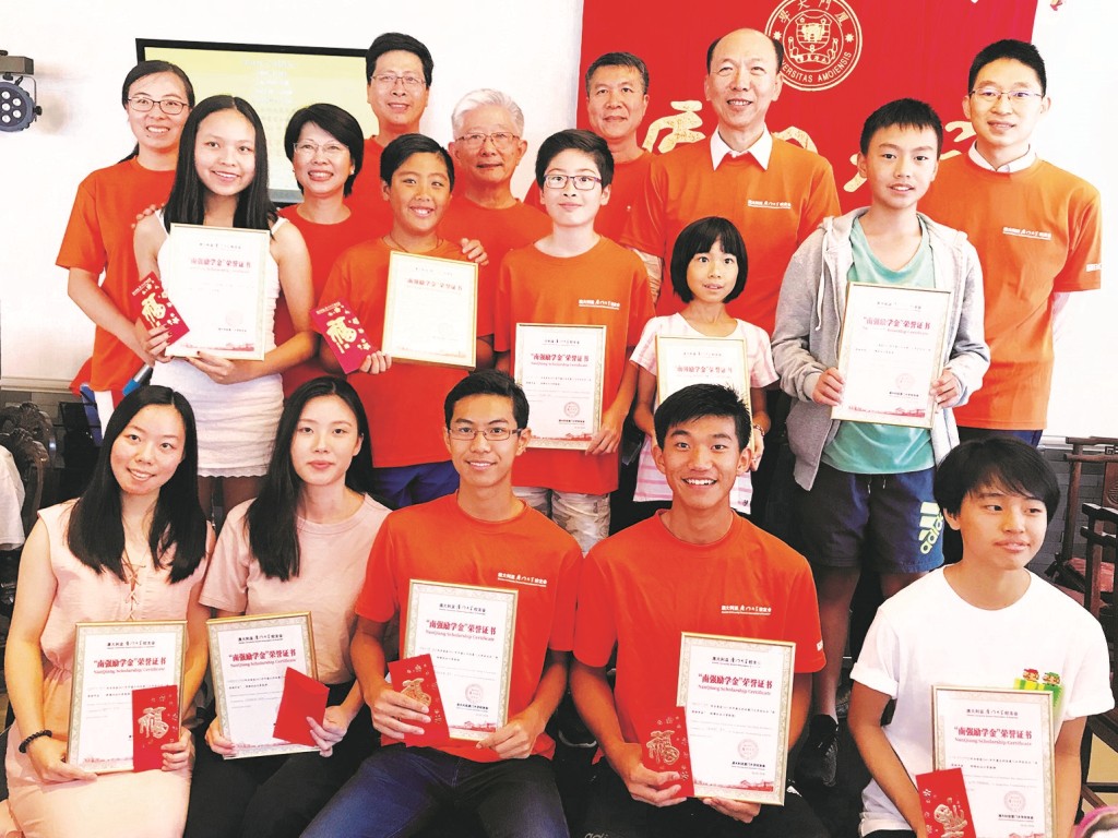 中国驻澳使馆参赞牛文起、领事侯永峰为获得“南强励学金”的校友子女颁奖