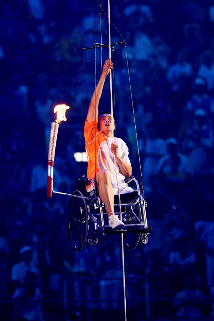 2008年9月6日22:59分,奥运火炬传递到了最后一棒。诺大的鸟巢中,坐在轮椅上的火炬手顺着一条垂直于地面的绳索,一下一下地向上攀爬。灯光逐渐暗了下来,只看到一束追光打在他的身上。在观众热切的目光与加油声中,他终于在近39米的高空停下,点燃了神圣的残奥圣火。全场沸腾了!