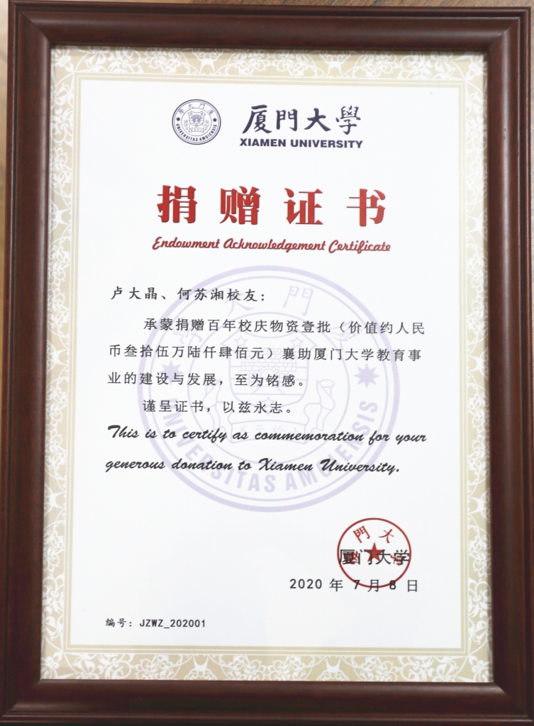 作为一名南强学子,卢大晶一直为校主陈嘉庚等爱国华侨教育兴国、毁家兴学的大爱义举所深深触动。毕业多年,卢大晶始终没有忘记母校对他的培养和教诲,始终弘扬嘉庚精神,立志为社会和母校做有益的事情,保持追求并主动践行至善至美的理想。扎根宁夏大地后,他开始为母校做一些自己力所能及的事情,为厦大扶贫干部、厦大研究生支教团、福建对口援建宁夏等提供了众多帮助,全身心地投入了感恩母校、奉献社会工作。