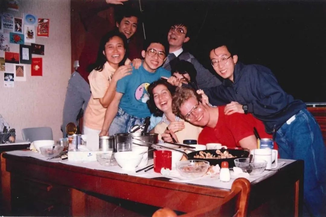 1989年法国留学期间,完成课题报告后同学聚餐庆祝(后排左一为李思明)