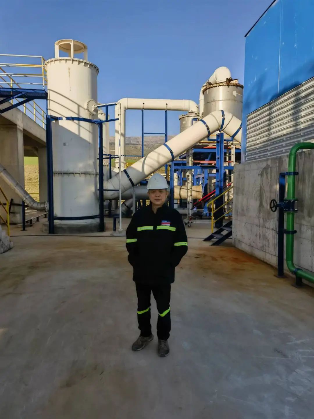 2023年,覃晓刚在他提供生产技术并负责设计的生产装置前留影(该装置位于土耳其哈塔伊省)。