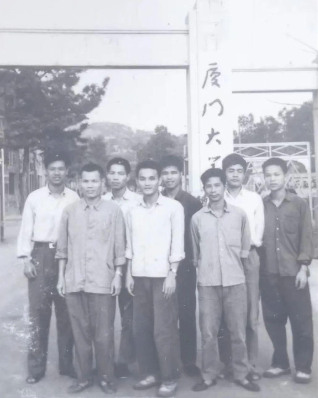 1975年,覃晓刚(后排右一)与班级同学在厦门大学校门前合影留念