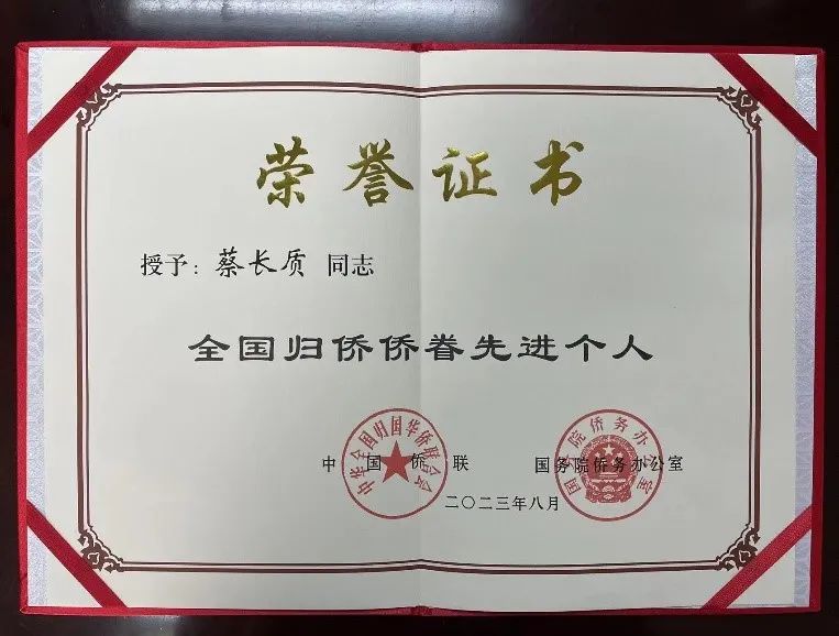 值得一提的是,在2023年9月初,在第十一次全国归侨侨眷代表大会闭幕之际,蔡长质荣获由中国侨联、国务院侨务办公室共同颁发的“全国归侨侨眷先进个人”表彰,对此,厦门大学澳门校友会、侨声中学等组织单位纷纷发来贺信。