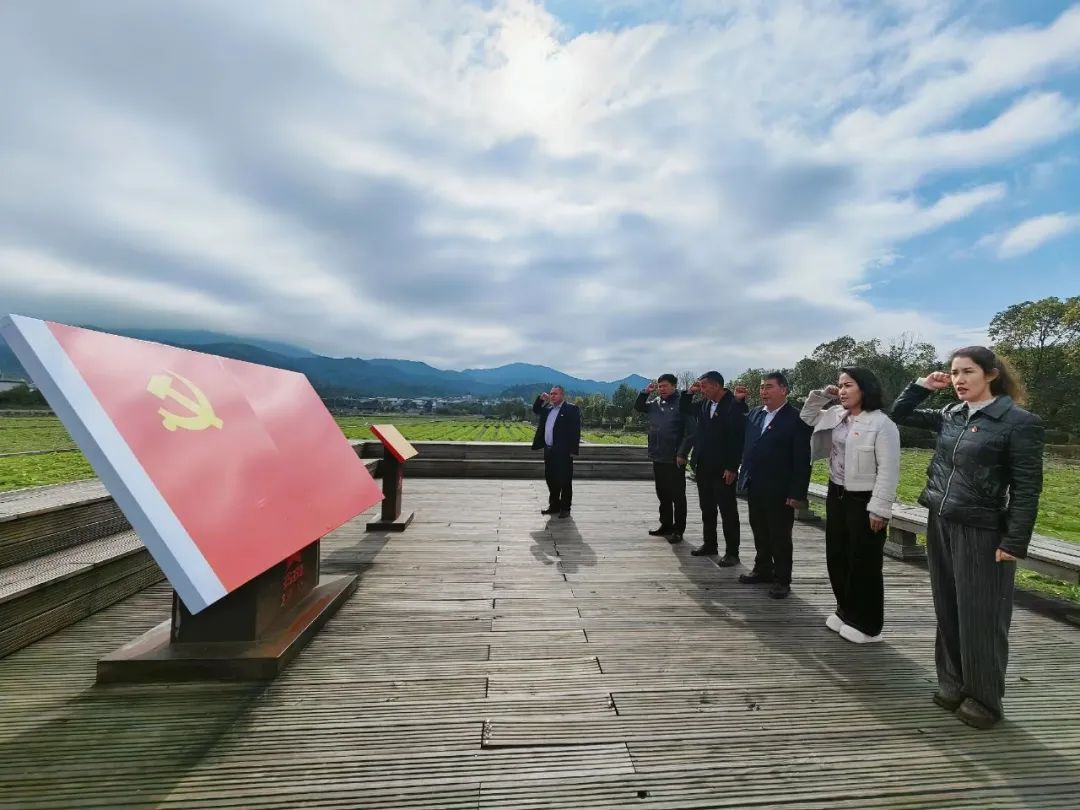 谢日那义·斯马义(左一)跟二十里店村党支部党员到福建省龙岩市古田镇开展支部共建活动,在古田会议会址重温入党誓词