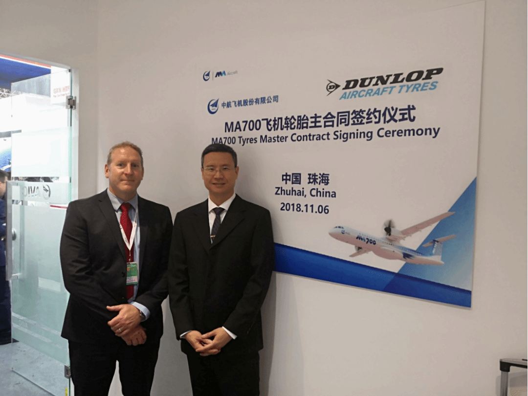 图为2018年珠海航展期间,西安中航飞机有限公司与英国邓禄普航空轮胎的主合同签约仪式前合影。左一为英国邓禄普航空轮胎有限公司董事长 Gordon Roper 右一为申凌龙(时为晋江邓禄普太古飞机轮胎有限公司总经理)