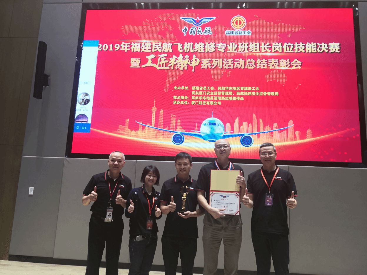 图为2019年中国民航华东局、福建省总工会、民航厦门监管局、民航福建监管局联合举办的福建省辖区各民航系统单位参与的工匠精神系列活动中,厦门霍尼韦尔太古宇航有限公司选派的质检班组进入班组长岗位决赛后的团队合影。右一为申凌龙(时为厦门霍尼韦尔太古宇航有限公司总经理)