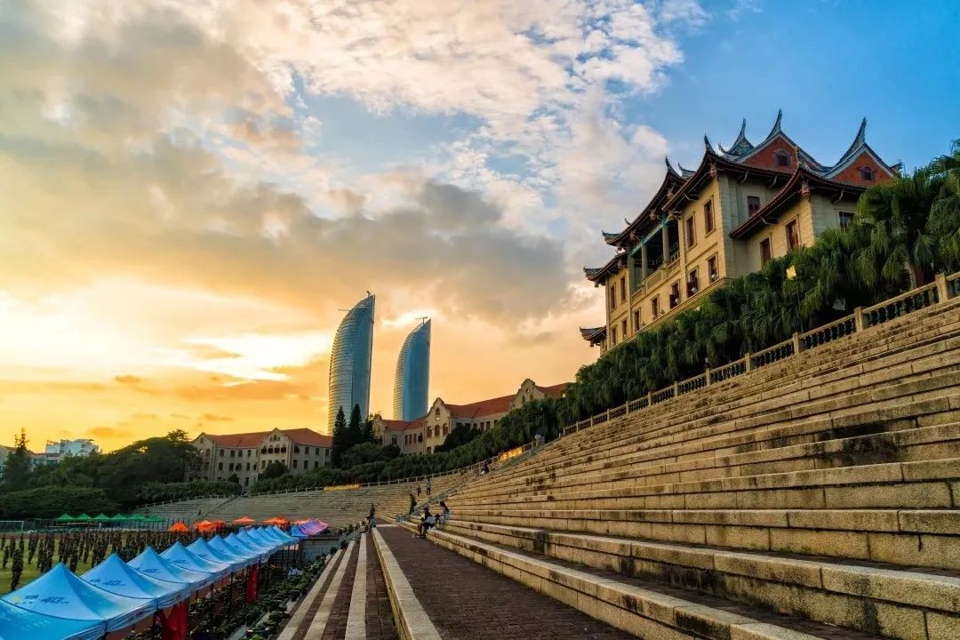 紧接着画面转换,又用两句对偶「五老峰幽,思源谷翠」从高(五老峰)到低(思源谷),用「幽」和「翠」点出厦大所处环境的优美;然后画面再转换到厦大门口的香火鼎盛的庙宇—-南普陀寺,点出这里还是佛教圣地,是游客必到之处。接着,画面再转换到校园内,又用两句对偶,芙蓉(湖)水暖,上弦(场)雾冷,点出此时虽然已经是湖水渐暖的春天,但清晨的雾还是冷的。这里再将时间拉到早上,为下一句「晨韵频惊宿鸟」,做一铺垫。拂晓,晨韵已经拉开序幕,运动场上的跑步声,运动声和湖边,海滨的读书声惊醒了树上的宿鸟。这是一所欣欣向荣,朝气蓬勃,充满希望和理想的大学。此时的我,想象着正站在厦大的高楼上,凭栏眺望美丽的海湾对岸,在海天连结处,新建的翔安厦大分校隐约可见,那里昔日人迹稀少的荒寂渔村已变成当今美尽东南的著名学府,旧颜换新貌。