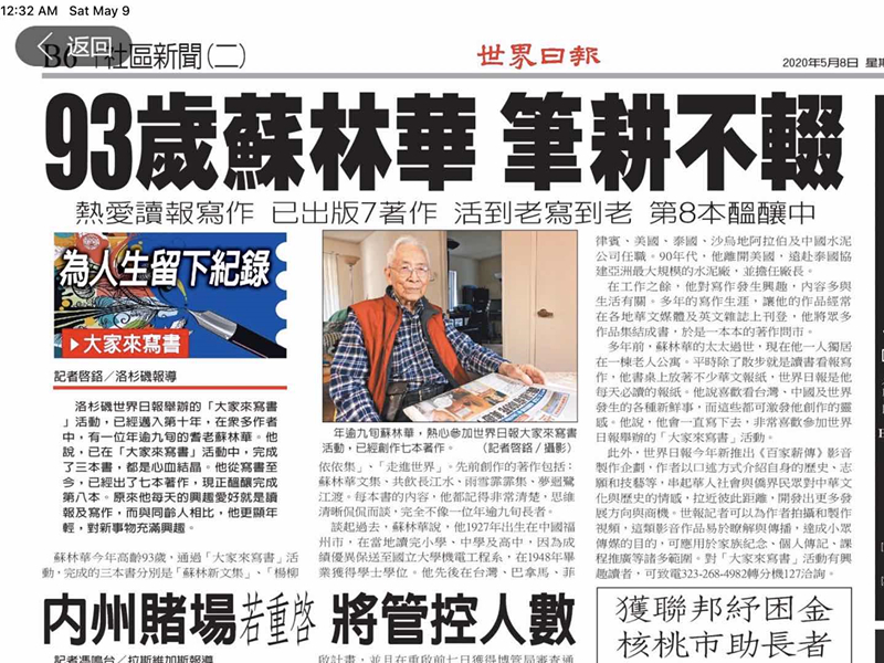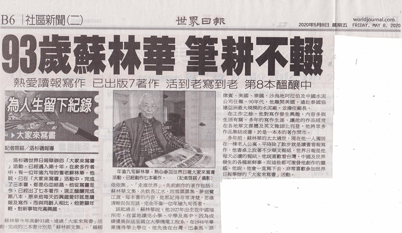 最近,在5月8日世界日报洛杉矶版B6栏内、有一条对我作专题报导,用繁體字印出大標题: