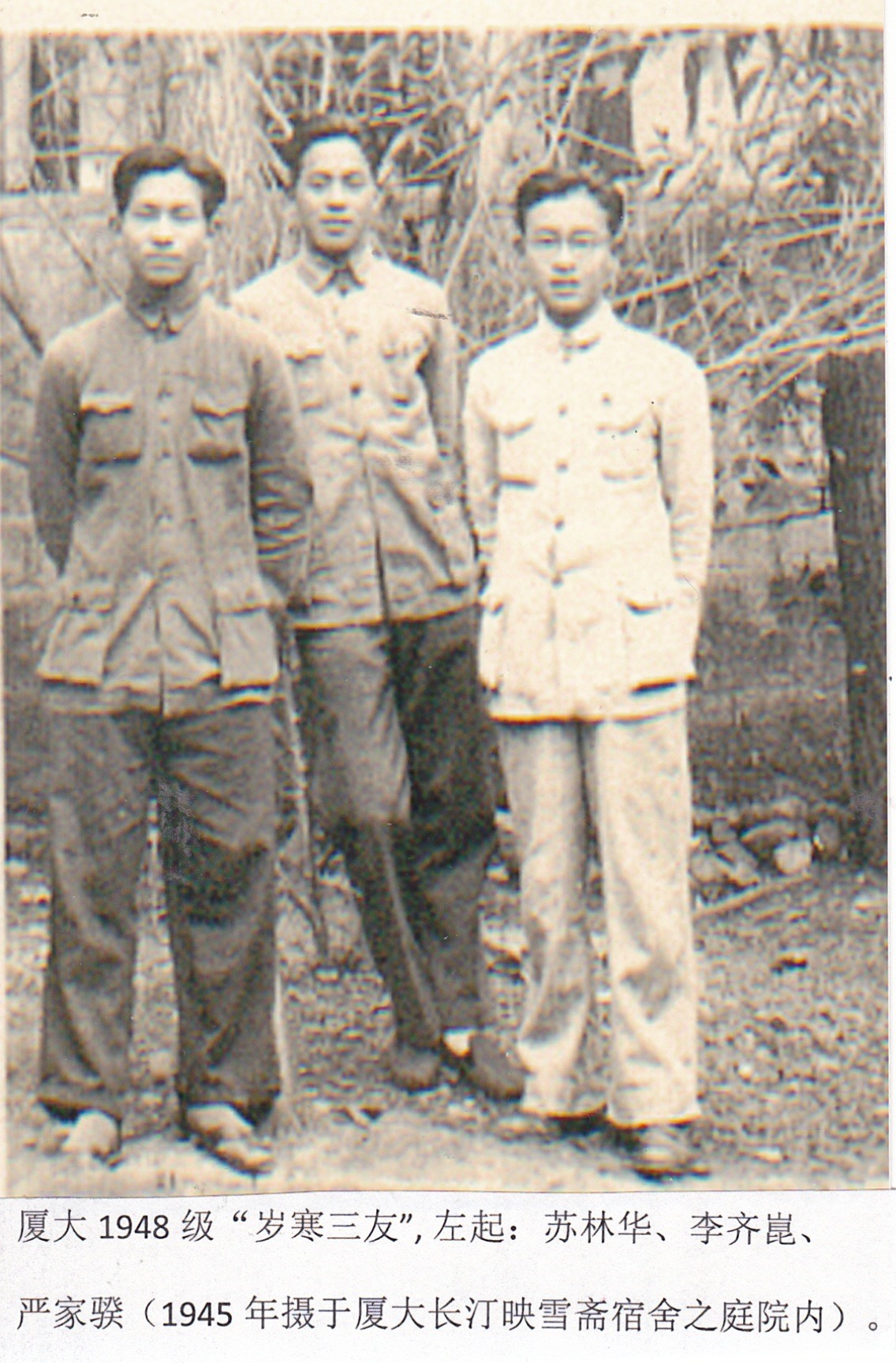 1945年8月15日抗战终于胜利,但由于厦大校本部被政府征用为日俘拘留所及日侨临时住所,故我们只好再留汀一年;不过我们群生级友六人、则离开遥远之博爱斋,搬到校中心区映雪斋居住,生活方式大有改进。但是年严冬时,我和室友李齐崑、严家骙、三人却穿着有点土气的中山装、在映雪斋庭里中拍了张“岁寒三友”照片,倒然留下该时代的实际生活写照。