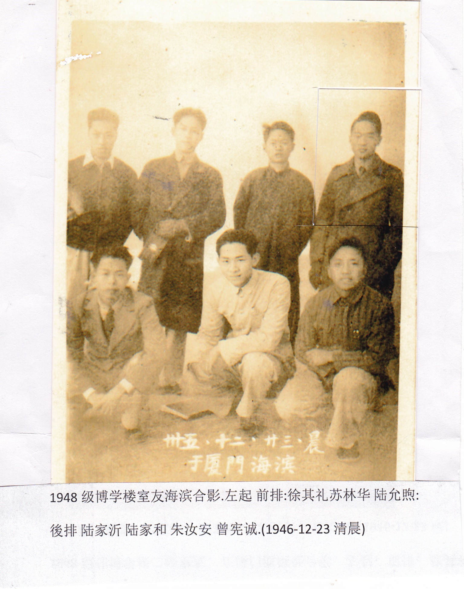 至于厦门方面----忆1946年秋、大三时,我们复员回到厦门校本部上课,主要教室在集美楼及工学馆,宿舍则在映雪楼及博学楼 (按:後此楼改名为 “ 厦门大学人类博物馆“ ),我们七人则合住在博学楼二楼左前方一室内。----除曾宪诚来自汕头中学、我来自福州英华中学外,其他五位则是来自省立福州高中,即有:陆家沂与陆家和兄弟俩、陆允煦、徐其礼与朱汝安。自本室可看到对海鼓浪屿。我们曾在1946-12-23清晨,在晨薄雾中到海滨拍了张七人照。惜如今、只留下陆家沂在西安、徐其礼在新加坡,及我在美西洛杉矶!