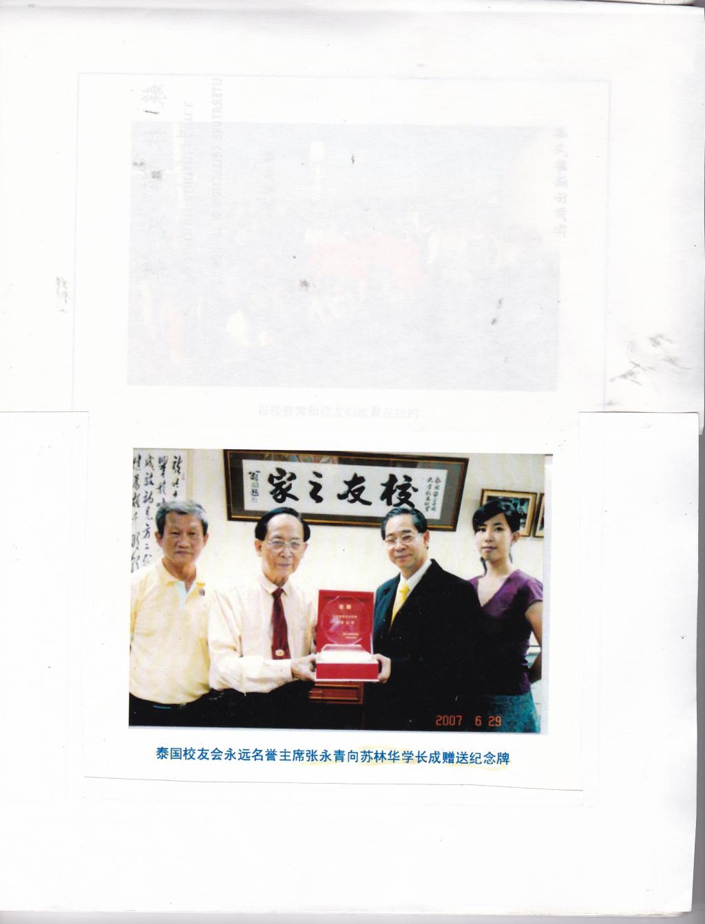 我离泰返美前,不但水泥公司当局及厂内员工都盛大欢送。即厦大泰国校友会也邀我到曼谷夜宴;并在”校友之家“内,由校友会永远名誉主席张永青颁发纪念牌、聘我为泰国校友会荣誉主席。-----(按:四位厦大校友合照中,左起为:曾心秘书长、苏林华、张永青荣誉主席、于翔秘书)。