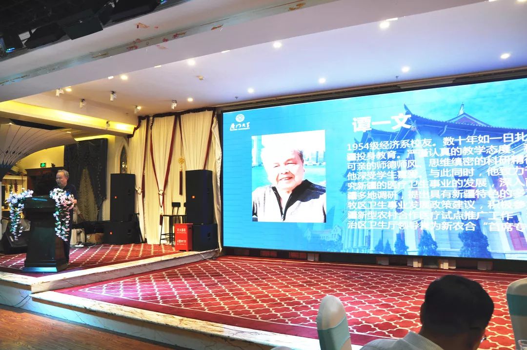 当老校友谭一文站上发言席时,聚焦了全场的目光。人们那时才知道,早在王亚南校长时期,就有以谭一文为代表的厦大学子,吟别苍茫大海,面朝巍巍天山而行。一甲子岁月悠悠而过,这位经受了反空袭、反炮击斗争考验的经济系学子,与同期创建的新疆医科大学一起成长,把全部的青春和所有的热情都倾注在新疆大地上。三尺讲台育英才,一双劲足量大地。61年来,谭一文学长行迹遍布天山南北近40个县市,被誉为“新农合首席专家”,为新疆的医疗卫生管理人才和新型农村合作医疗事业做出了不可磨灭的贡献。