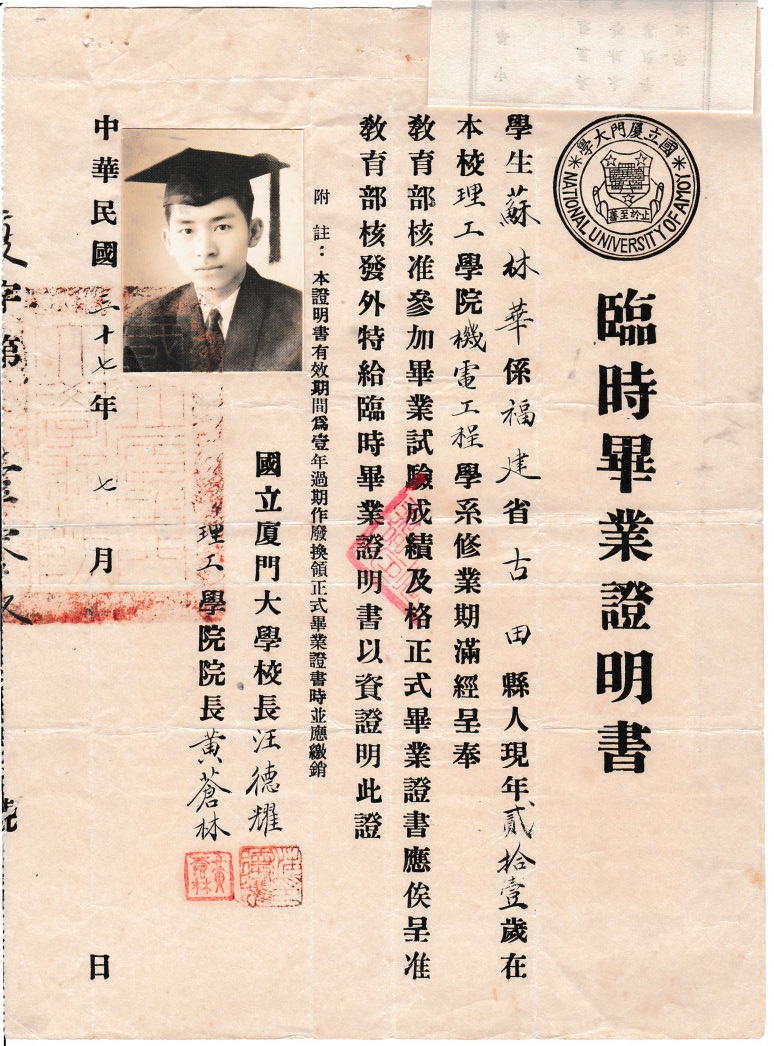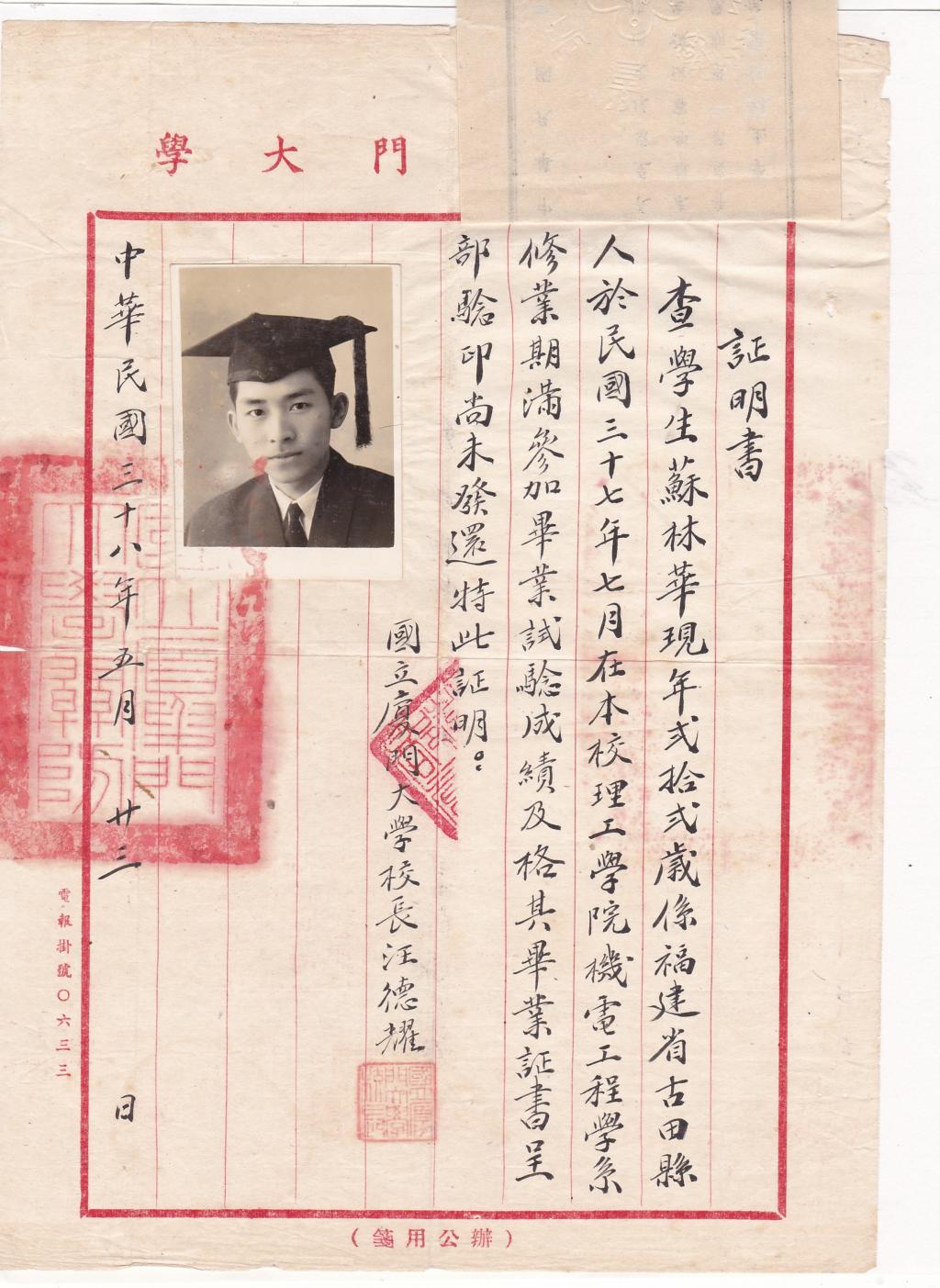 其时国内内战方殷,在此期间,我预知可能发生的情况,即今後我就业在台湾,故在民国38年(1949年)5月向厦大校方申请加发不具 “临时毕业”字眼的 “证明书“,承教务处在刻有 “国立厦门大学” 字样的信笺内、用毛笔写出证明书,内容如下(请参看附件):
