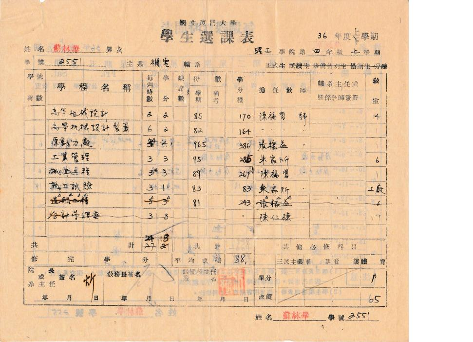 *(现顺便将当年每学期填写完妥,得到注册组主任、教务长、院长(或系主任)签章的“学生选课表”,挑出大一上及大二下的样本二份,以附件示出)。