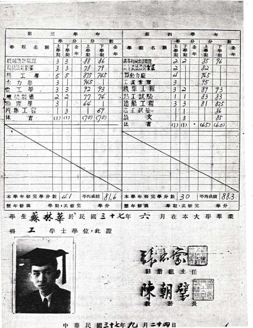 学生苏林华于民国三十七年六月在本大学毕业得工学士学位,此证