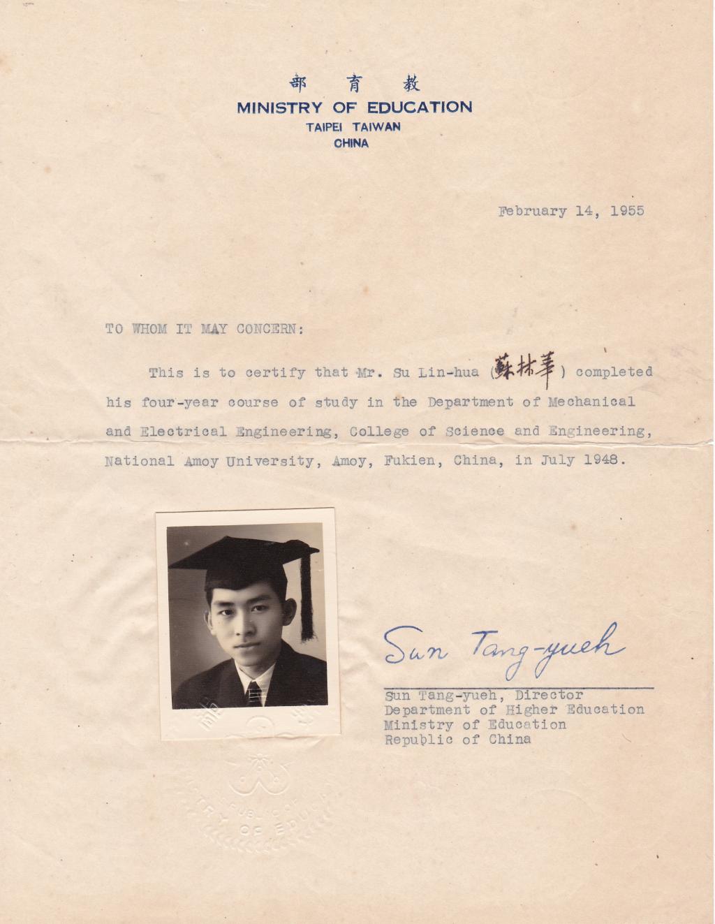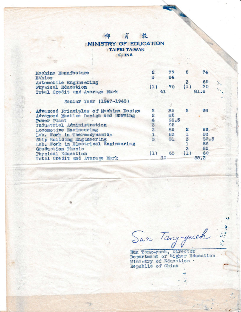 上示之修业证书 (成绩单) 經呈文教育部,申请发给我英文证件。經先後在1955年2月14日取得教育部高等教育司司长孙宕越(Sun Tang-Yueh)颁发的英文毕业证明书与二页英文成绩单;其後、1974年10月30日时,又由後任司长林清江((Chibng-jiang Lin)) 颁发一次英文毕业证明书。-----现将三者均附于此。