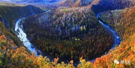 在黑河市赏秋,锦河大峡谷是必去的地方,她是大兴安岭的余脉,是黑土地五花山的代表作之一。黑龙江的支流石金河流经此处,天然地形成了一个欧米伽形状的独特走势,与之游览过的美国科罗拉多大峡谷、东非大峡谷、恩施大峡谷相比,锦河大峡谷的秋色是一片广袤的林海之秋。走进大峡谷,给人的第一感觉,犹如进入了一个盛大而别致的盛装舞会。峡谷最深处有几百米,蜿蜒的木栈道向峡谷深处延伸,栈道两旁丛林茂密,野生的落叶松、白桦、黑桦等,不论高矮粗细,每一株都身着秋日盛装。赤橙黄绿的树叶,在徐徐的秋风中摇曳,沙沙作响。小条纹松鼠时不时地在林中上蹿下跳,吸引着游人的目光。鸟鸣虽不绝于耳,但仲秋百花的姹紫嫣红,却把风头让给了一直陪伴着它们的叶子们。站在山上,谷底的流水声,清晰可闻;站在观景台上,就像站在锦河的肩膀上,五花山秋色尽收眼底;下到谷底,河水清澈见底,不急不缓,从容地淌过“欧米伽”向西流去。