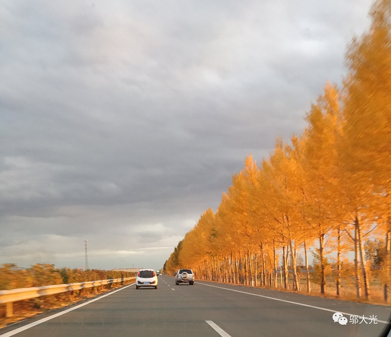 开始返程了。虽然仅仅过去了三天,但回程的秋景与去的时候相比,秋色似乎又多了几分成熟,似乎又长了几岁,显得更加妩媚,更加迷人。几夜之间,仿佛又换了一个秋。在下午四、五点钟的时候,黑土地好像知道我们是远方的客人,似乎知道我们是在返程,特意给我们展示了一幕千载难逢的秋景:火烧云出来了,夕阳在火烧云的衬托下,红里透着金黄金黄的光,就像剧场里灯光师精心布置的聚光灯,把公路两旁的白杨树照射的金光闪闪。汽车开始了与夕阳赛跑,尽可能地让远方的客人多看上一眼这难得的景色。以至于导游都说:做了八年导游,第一次看到如此金碧辉煌的秋景!