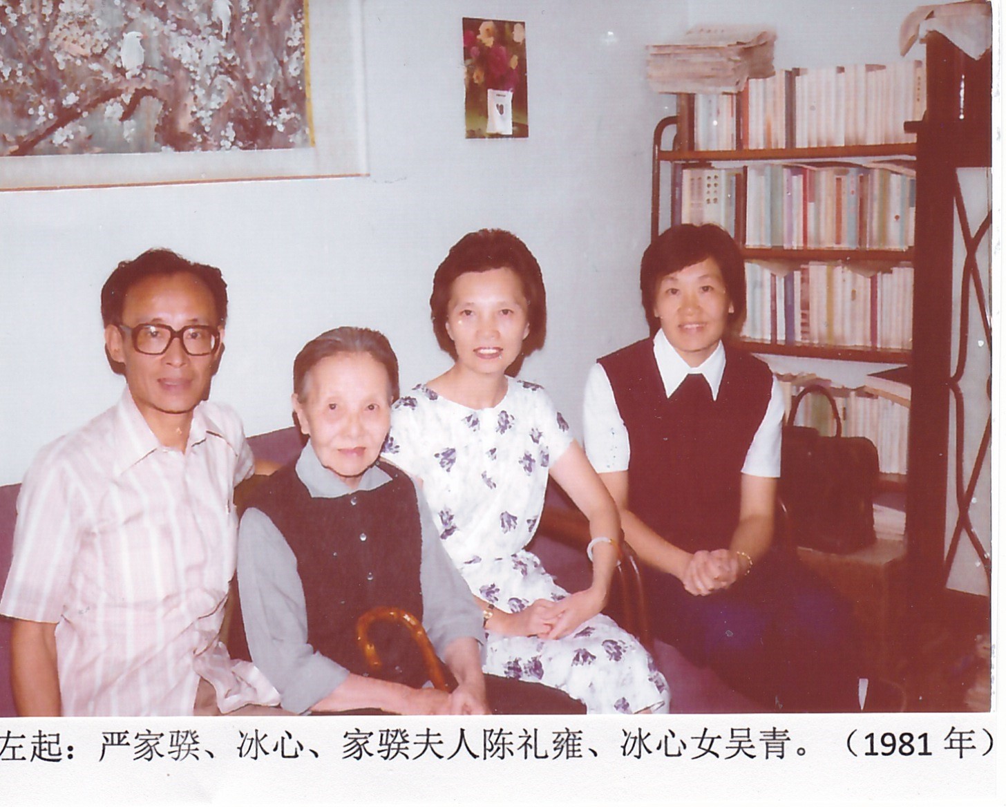 级友严家骙兄、厦大1948年土木系毕业,在台湾水利局及台湾电力公司服务多年後,1967年以水文专家身份应聘在维也纳之联合国原子能机构工作,退休後定居奥地利。2016年10月、 他出版了《严家骙文集》一书,其中《拜候冰心表姨记》一文引人注目。原来冰心是家骙母亲的表妹,故他是冰心的外甥。1981年时、家骙与夫人陈礼雍回国探亲,到北京时专程拜候冰心及其女吴青教授,承赠《冰心选集> 及《晚晴集》二书,四人并合影为念。-----由此观之,萨校长和家骙都是冰心的表亲。