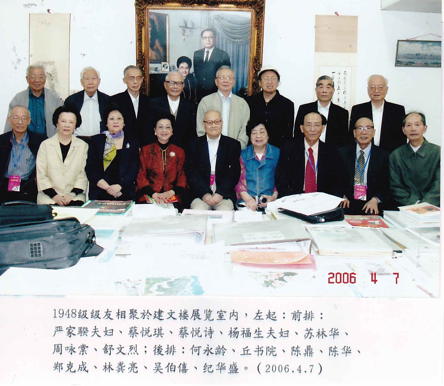 2006年4月6日为厦大建校85周年日,1948届级友多位受邀返校庆祝,杨福生夫妇自北京来、严家骙夫妇自奥地利来,两家相遇、正是 “他乡遇故知” 。4月7日,级友及家属17人在级友丁政曾与夫人蔡悦诗捐献建文楼之1948级展览室内合影留念。-----惜如今: 丁政曾、蔡悦诗、杨福生与林龚亮都走了,空余我们的永久怀念。