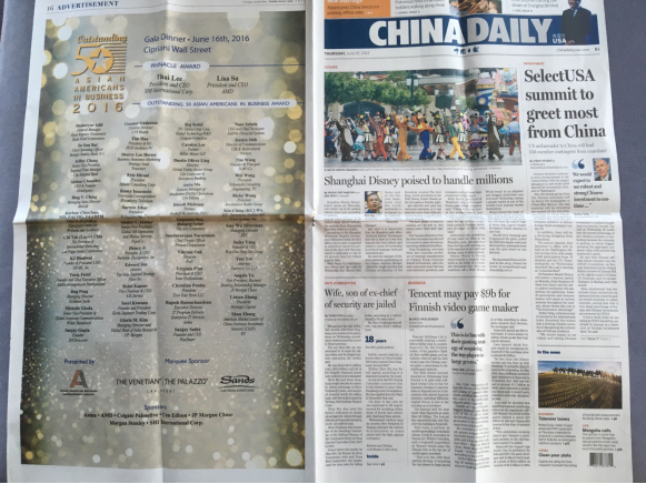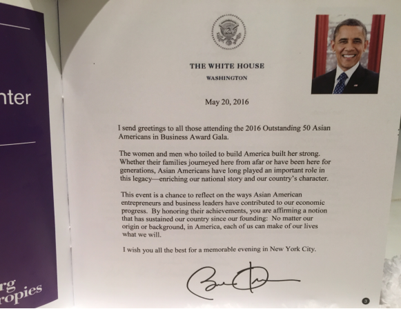 在北美生活了三十余年的我们,深深知道该奖在美国极有声望。多年来被授奖的亚裔精英,确是精华之精华,为美国社会的发展和进步,从政治,经济,到商务等各种领域,做出了极大的贡献。美国总统奥巴玛特致贺函(图2),中国日报英文版全篇刊载授奖名单(图3)。大女儿能在这人才济济的美国商务界脱颖尔出,被选为精英之一,我们夫妇真有“漫卷诗书喜欲狂”的感觉。我和太太,分别酌上一杯小酒,举杯庆祝,聊起女儿的成长过程,以及中华文化对第二代移民的影响。其中,自然地谈到了厦大。