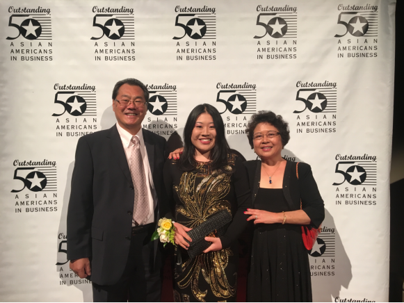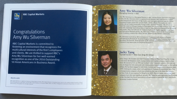 授奖宴会的日子终于来到。我们夫妇专程从定居的北卡州飞到纽约参加典礼。该仪式在华尔街的CIPRIANI宴会大厅举行。当晚可说是保安严密,宾客如云。不少亚洲国家的高级外交人士也专门出席。大女儿所奉事的全球十大银行之一加拿大皇家银行在纽约的RBC 资本市场公司(RBC CAPITAL) 也特别赞助(图4:女儿公司赞助消息和她的简介)。宴会桌上,除女儿夫妇和我们夫妇之外,还有六位女儿的 RBC 同事,专门前来恭贺。看着上台领奖的大女儿,亭亭玉立,落落大方,充满自信和朝气,我们夫妇可说是喜笑颜开,心花怒放(图5:与女儿同影)。我们也深深知道,她一定能继续奋发,自强不息,以自己独特的方式不断追求,永远上进。