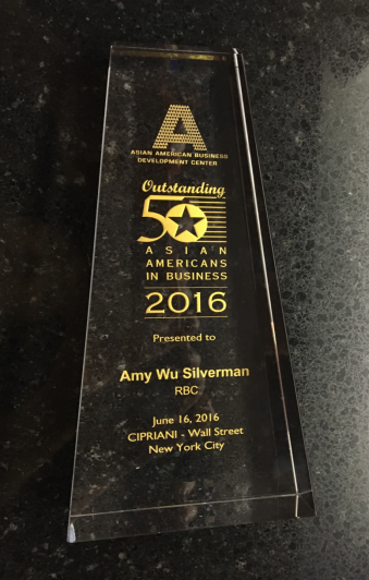 2016年初夏的一个早晨,叽叽喳喳的喜鹊给我们夫妇捎来了一个喜讯。我们在华尔街创业的大女儿,伍怡丰 (Amy Wu Silverman), 被光荣选为美国 2016 年亚裔商务精英 50 强之一 (图1:奖杯)。我们夫妇也被热情邀请参加她的授奖宴会。