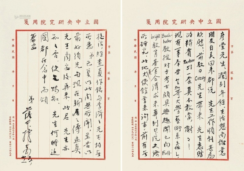 阔别年余,生活想尚称意。朋友自美回来,都说先生工作顺利,甚为欣慰!前数日Cressy先生带来先生惠赠的精贵Parker 51一套,真不敢当,谢谢!现有一事奉告,芝加哥大学艺术系主任L.Bach-hofer教授对于考古颇具兴趣,闻已向Full-bright教育基金会请求来华到本院史语所研究。此地美大使馆曾来询事前有无接洽,经查夏作铭与李济之先生均无所悉。弟已复以此间无所闻,并告以最好须先与现在“新居”之傅孟真先生商妥后再来。此君先生亦知之否?便先赐知。先生何时返国?都在念中。