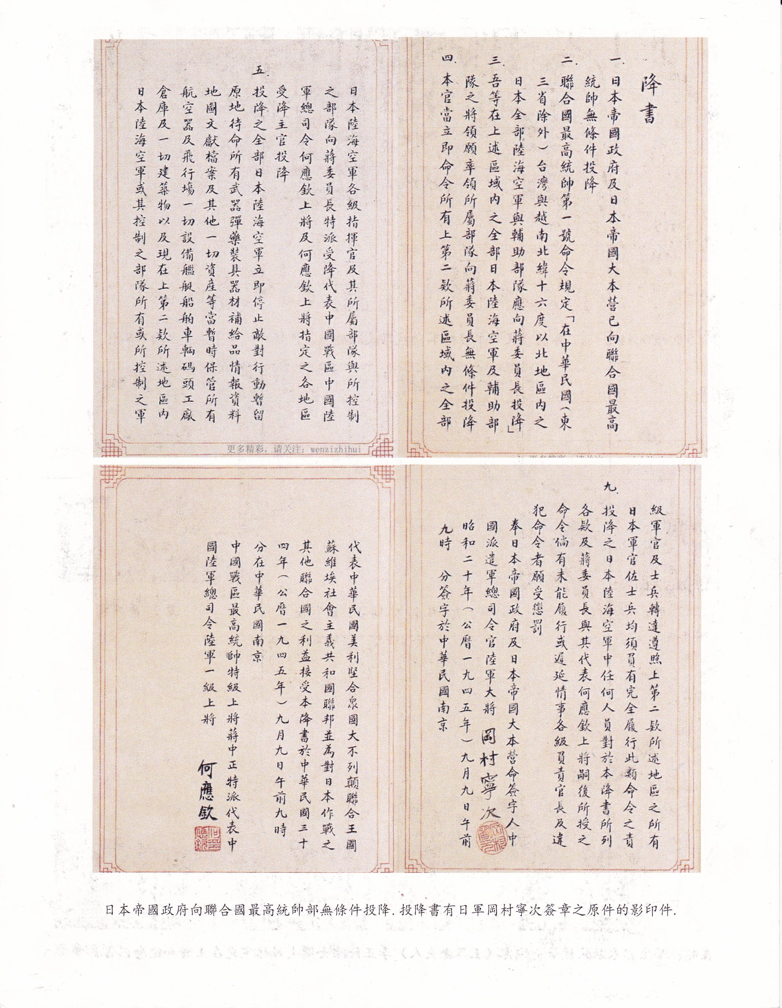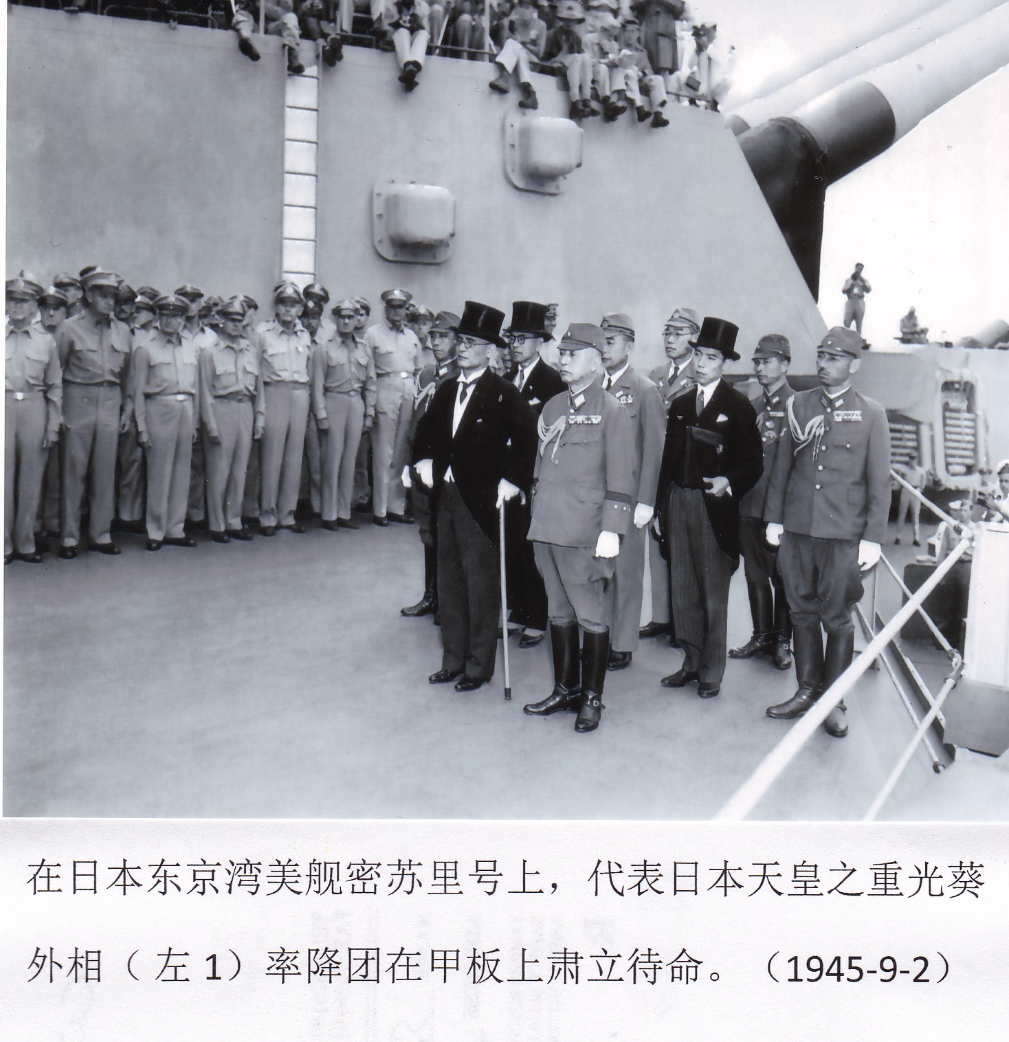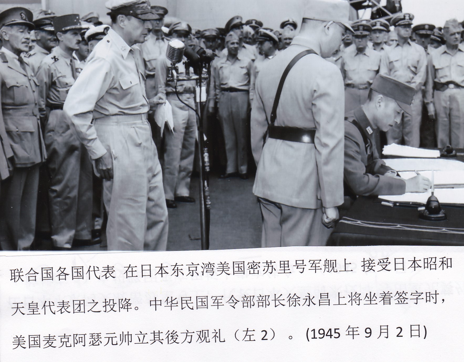 九月初,有颇为特别的受降典礼,即战胜国在日本东京湾的美国主力舰密苏里号上举行受降仪式。由日本外相重光葵代表日本天皇向中美英苏和各盟国代表签降书,美国除麦克阿瑟将军外,还礼遇自俘虏营放出的魏锐特将军加签;我国由国民政府军令部部长徐永昌上将全权代表主签。我们闻讯,更是欣然。