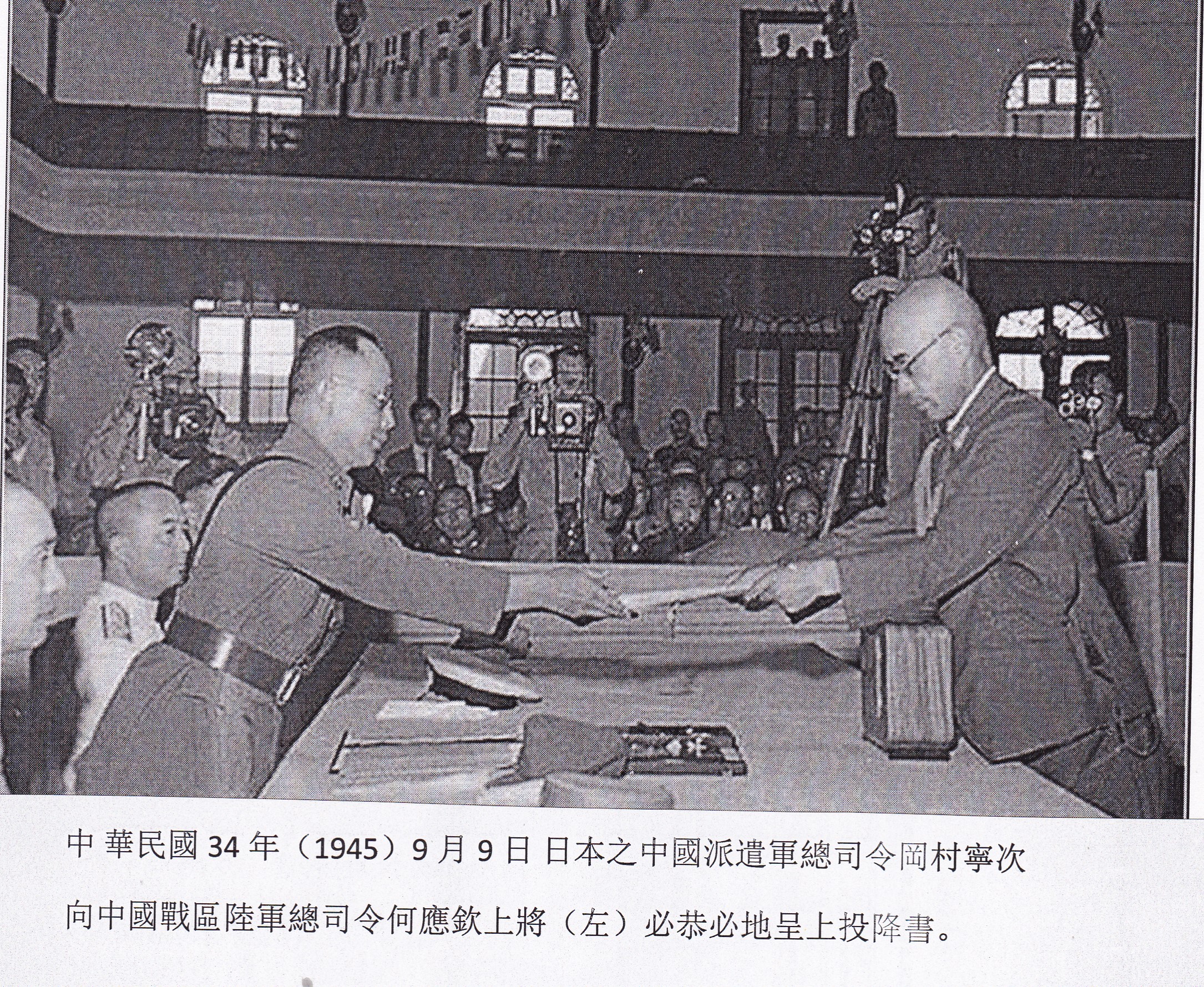 9月3日在国民政府国都南京举行正式隆重受降典礼,冠盖云集,盟军首长也来观礼,日派遣军总司令冈村宁次向何应钦上将除呈递降书外,还把其佩剑一并呈奉,颇有日本古代武士之风。后国民政府明定九月三日为军人节,也是抗战胜利纪念日。