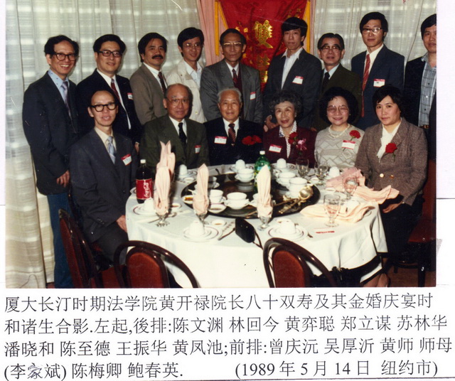 到了1989年5月14日前几天 ,吴厚沂理事长来电,说长汀时代担任厦大法学院院长的黄开禄教授夫妇自美西来纽约,举行八十双寿及其金婚庆宴,邀厦大学子参加。我们去了,庆宴开始前有15人之合影,今附于此。即拍照时,左起,前排:曾庆沅、吴厚沂、黄师、黄师母李家斌、陈梅卿、鲍春英;后排:陈文渊、林回今、黄弈聪、郑立谋、苏林华、潘晓和、陈至德、王振华、黄凤池。