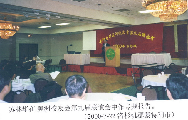 到了2000年7月22日在南加州蒙特利公园市之林肯大酒店内举行第九届联谊会,由理事长李联欢学长主持,陈申学长总联系。当日的“创业讲座”由何宜慈、张新雄、陈申及陈师雄诸学长开讲,另邀我代表泰国校友会讲《厦大与我的水泥生涯》,我并以投影机将泰国建厂期间之雄伟土木工程和巨大机械的照片放映出来;周咏棠兄则代表台湾校友会讲《环球之旅》。当日厦大并由潘世墨副校长代表校方前来祝贺并致辞。会中并举行下届(2000-2002)理事会选举,选出九位新理事及推举傅志东学长为理事长。会中有大合照。有关此次联谊会活动详见 2000年10月出版的《美洲校友通讯》第三十九期上。