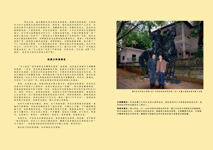 然而,这尊塑像的创造者李维祀先生却鲜为人知。笔者曾多次对记者建议,将笔触、版面聚焦一下李先生。令人扼腕的是,李先生已于2011年6月与世长辞,他当年创作“马上成功”的种种故事,再也无法通过第一手途径得悉。春节后的某天,笔者与泉州《东南早报》专题部记者一道,驱车前往厦门大学,采访李先生的嫡传弟子吴荣华老师,从中了解了一些片断情节,兹略作整理,以飨读者。