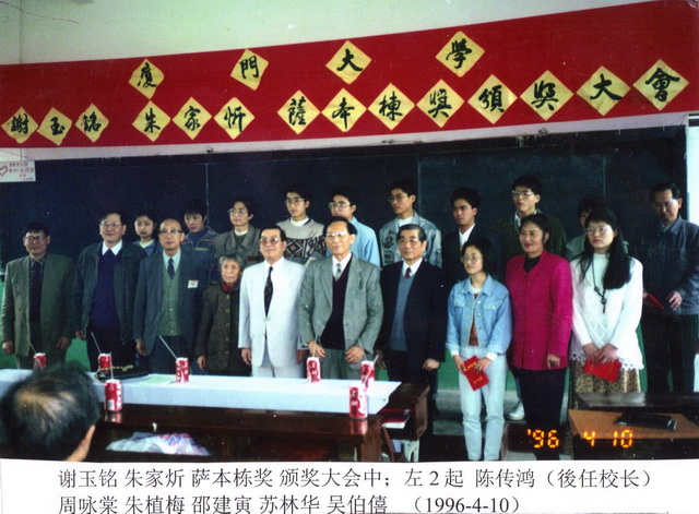 但机电系学子们不会忘记先贤,故有菲侓宾及台湾校友捐赠奖学金,以记念机电系创办人萨本栋校长,居中推动之谢玉铭教务长,和造就十届机电系毕业生的朱家炘系主任。现附1995年4月10日一张颁奖大会照片,可知其况。(按:不过红布上的“炘”字被误写作“忻”字。)