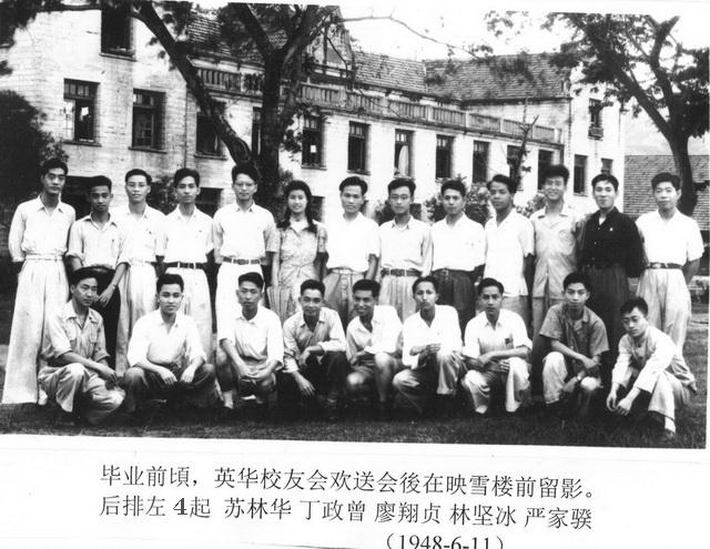 大四时,我住映雪楼三楼,虽冬季时“高处不胜寒“,但清静得很。毕业前顷,福州英华华南中学校友会欢送我们5人(即丁政曾、严家骙、林坚冰、廖翔贞与我)时曾合照,今仍保藏。1984年时,我离校36年后回校,还特地和室友林坚冰教授在当年卧室及标有”映雪“楼牌前合影,另,同行之廖开治与舍妹苏寄漳和级友丘书院教授也都入镜头。