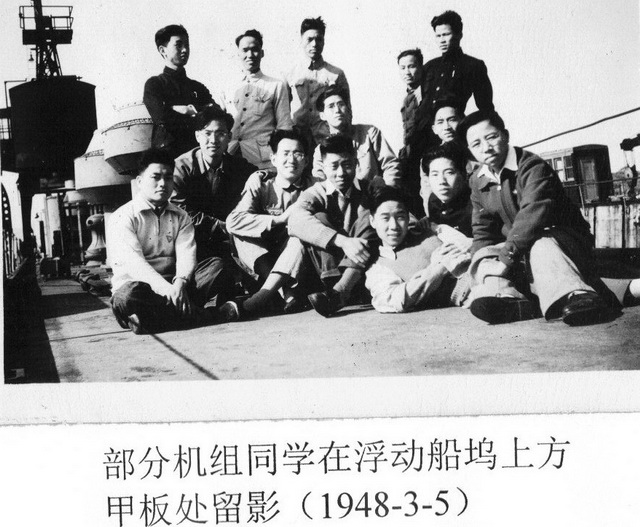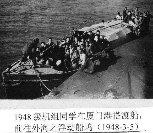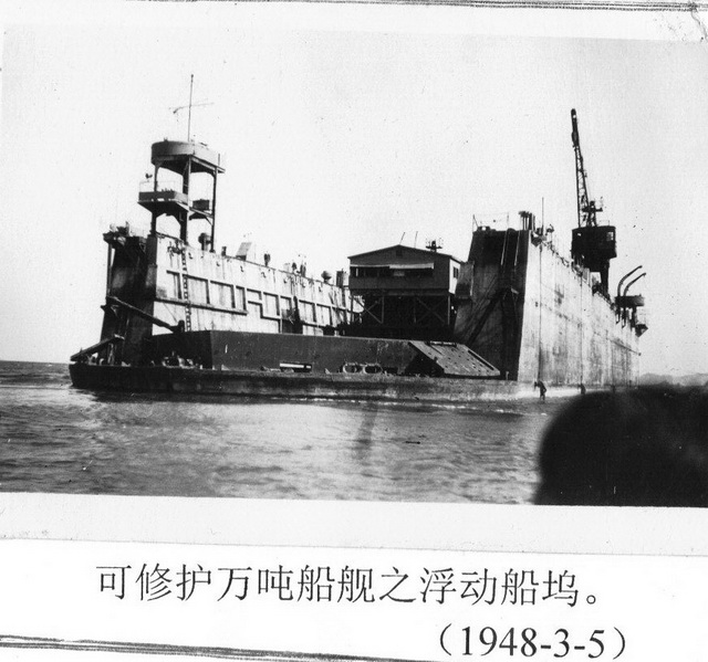 令机组同学难忘的是他带领我们到外海参观美国海军留下的可修理万吨巨舰的“浮动船坞”,它二战时在南太平洋服役过的。修船原则如下:即待修之船要入坞修理之前,全坞先下沉相当深度,使船可进入其中心区,然后全坞上升到可以作业的程度。——据照片,参观是1948年3月5日之事。