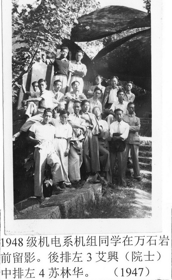 我们1948级毕业50年后,级友们(及机电系系友们)在厦大大团聚,级友范志增兄忽将陈福习教授的著作 《机械设计原理》的封面和“绪言”的复印件见示,才知陈师将讲义抄正本送上海 “龙门联合书局”在1950年5月出版了。他的绪言中有如此谢词: “在编辑过程中,稿件承余长庚,邵建寅,艾兴,郑光敏,王婉,林琴南,章桐生,史济智,林炳镛,苏林华,范志增诸同学代为缮清,——均此志谢。” 见到我们这四级友竟然名列其内;而列名前头的七位多半是助教或高班生,不过其中的艾兴固曾任助教,则是我们1948级级友及机组系友,他目前是中国工程院的院士,专业“机械”,任山东大学教授,是个大名人了。(按;我们毕业前,机组有18人参加万石园郊游合影中,他立后排中央,现附此)
