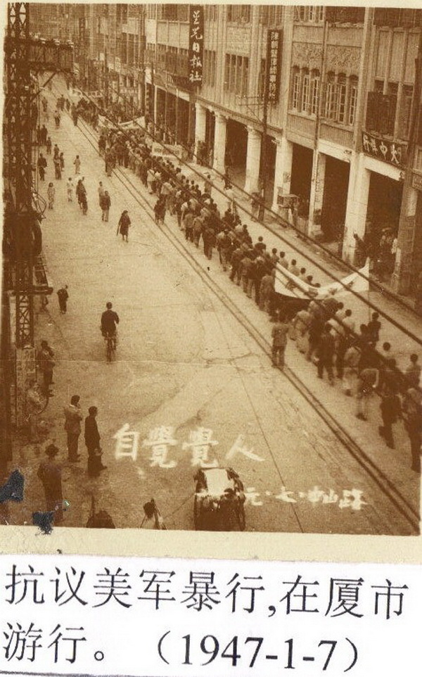 故1947年(民国37年)1月(元月)7日,同学们在群贤楼前方大操场集会。学生自治会会长陈景汉在台上声色俱厉,暴跳如雷地指责美军,艺术家朱一雄则在台上看着兰天,像诗歌朗诵般地漫步说 “我们手拉手,我们向前走……”。之后游行队伍进入市区,在码头处有大一新生(包含台湾籍学生)来聚,绕市一周后才返校。