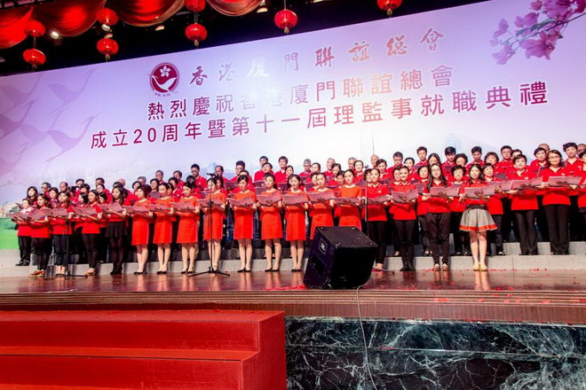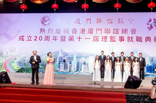 当晚文艺演出的第一个节目,是由香港厦门联谊总会组织的百人大合唱,其中有超过百分五十是厦大人。第一排由十位厦大旅港校友礼仪小姐和厦大母校艺术学院专程来香港庆贺演出的年轻校友而成,青春靓丽,吸引眼球。大合唱由母校艺术学院段永纯教授作专业指导。三首合唱歌曲:香港厦门联谊总会会歌—《联谊之歌》,唱响了香港厦门联谊总会团结、包容的和谐氛围;厦门大学旅港校友会之歌《扬帆香江》,唱出了厦大校友自强不息,止于至善,南强之光把东方明珠照亮的风采和精神面貌;《鼓浪屿之波》一首优美动听而又经久不衰的老歌,把厦大人的思绪带回了厦门。鼓浪屿是厦门的标志,也是厦门人的骄傲。我们所有厦大人都曾是厦门人。当您考入厦门大学,当您的户籍从全国各地迁入厦门时,您就成了厦门人。厦门养育了我们多年,我们曾经共沐鹭岛阳光,同饮鹭江水。绝大多数的厦大人都在厦门度过青春岁月,谱写了许许多多终身难以忘怀的青春乐曲,所有厦大人都和厦门有着不解的渊源。