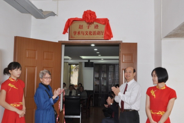赵子逊先生的夫人林淑吟女士(左2)和厦大外文学院纪玉华院长(右)为活动厅揭牌