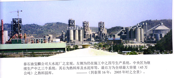 至于我在泰国原服务之『泰石油宝麟公司』及其水泥厂,我则经常与旧属保持联系,因而得悉第四套生产系统之主机与其电力及仪表设备之外购仍受限于财团及债权人集团,尚未通过。(按:在我行前,也只能自行添建熟料库、水泥库与包装出货系统而已);老板转而另辟途径,开拓多元化产品。