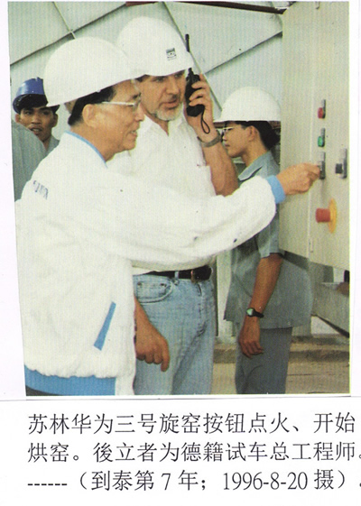 有关试车及运转事宜,均由我全权指挥厂方工程人员及德方试车工程师进行(按:在试车期间,照合约规定,须由德方专业人员分别负责,但我方有监督及配合之责,以迄性能测验,移交我方之后,才由我方全面主导运转及生产事宜)。此工作在1991年中起,即一直进行至1992年8月19日,正式举行第一套生产系统之开工典礼。公司当局特别邀请泰国皇室诗琳通公主前来主持,旋即顺利投产。(按:诗琳通公主曾访华十余次,她并曾专程访问厦门大学,校方特授予名誉教授职),后旋窑性能测验结果超过7500吨/日(我离厂之前几经改善,已提高至8200吨/日)。在此期间,第一套系统水泥年产能力可达到250万吨。我们制造第Ⅰ型普通水泥、第Ⅲ型早强水泥,与泰国特有之混合水泥(即除熟料与石膏外、加入约30%石灰石者)。