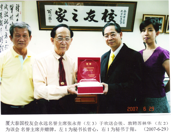 政曾在泰养病期间,蔡悦诗学长整合厦大泰国校友,于1998年3月15日成立厦大泰国校友会,担任会主席一年后,退居二线,晋升为永远荣誉主席。我因已是厦大美洲校友会会员,故他们初聘我为名誉顾问,继为荣誉顾问,而在我退休回美前顷,欢送会时,他们则礼聘我为『荣誉主席』。 在泰期间,每年三月,均在曼谷大饭店庆祝成立几周年庆典,并预祝厦大四月六日校庆,我则年年参加,至于校友各种活动,我也必参加。