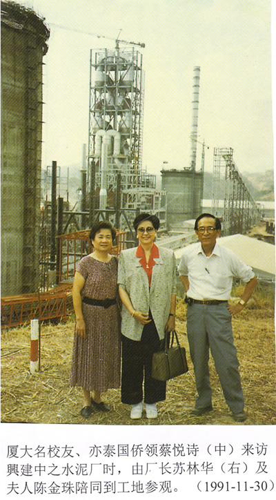 1989年,我服务于美国宾州『富乐国际公司』(Fuller International Co.)担任『中国地区经理』职,主持技援中国、协助发展其水泥工业。是年中,我由公司派遣偕同富乐加拿大分公司一代表,前往北京,与中国经贸部,建材总局及山西潞城水泥公司有关人员洽谈有关其水泥厂扩建事宜,在『二里沟』谈判大楼内连续洽谈已两、三个月了。大约八月中,忽接我英华高中及厦门大学级友丁政曾兄,及其夫人蔡悦诗学长发来电传,说是其时泰国之水泥市场一直呈蓬勃气象,但国内生产能力有限,供不应求,故其友人,亦即泰国侨领廖氏家族拟在北标府(Saraburi)兴建一座最现代化之世界级大水泥厂,他们要寻找一位在水泥界具有经验人物前往主持建厂大计;由于我在1948年自厦大毕业后,一直在台湾、美国及世界各地水泥工业界服务已四十年,故政曾夫妇盼我前往泰国一行,了解实况,并与廖氏家族主要人员见面。但我以潞城案至九月份才可决定,且签约后,仍须先回美复命,故一直延至是年十一月下旬感恩节,有长假期间时,才得自美飞泰一周,与廖家主脑人物会晤,阅有关建厂资料、图件及德国与丹麦方面之机器设备规范书等,并由政曾兄陪我前往北标府工地,勘察现场,加深印象。