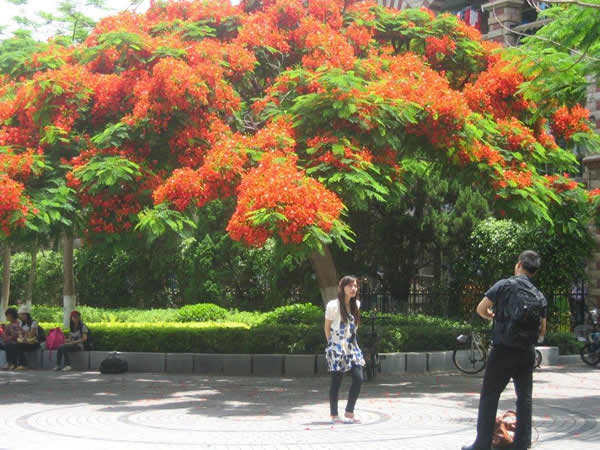 也许是我过于沉湎凤凰花色的唯美:记得在土耳其教书的时候,身在曹营心在汉,为《厦门大学报》写了《凤凰花期的奖学金》,灵感是借用了“有风”在博客上的玉照《凤凰花开的路口》,那花树花团,那花伞花裙,犹如一阵晚来急的花雨,沐浴身心;又恰似一片朦胧的花云,轻盈来去……